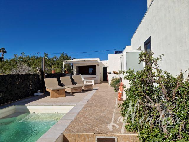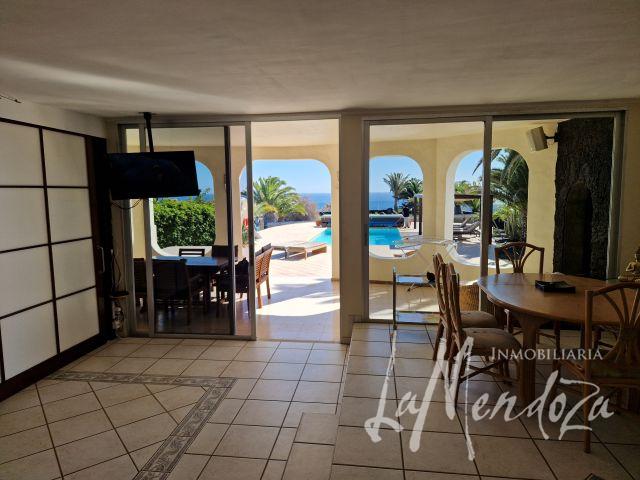 The main house comprises 2 large bedrooms (the master bedroom offers a large panoramic window with views towards the sea), 2 bathrooms, very spacious sitting and dining room, separate kitchen with larder/utility room, terrace with typical Canarian features, swimming pool, sauna, jacuzzi, gazebo, carport and garden.